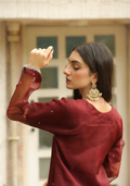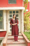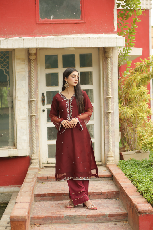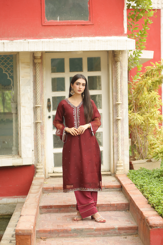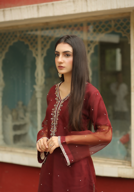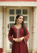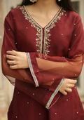 Empress Red Handworked Suit – Classic Grace with Royal Detail, Designed for women who appreciate fine craftsmanship and refined beauty.The dress features intricate handwork on the neckline, sleeves, bottom, and daman, adding a luxurious, artisanal touch. Each detail is carefully finished to create a balanced look that feels regal yet wearable. The subtle embellishments enhance the outfit without overpowering it, allowing you to feel confident, graceful, and polished.