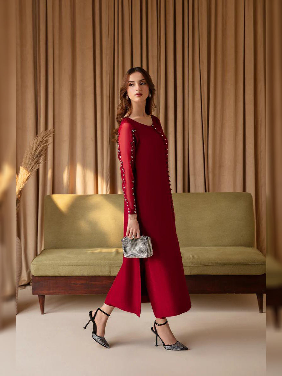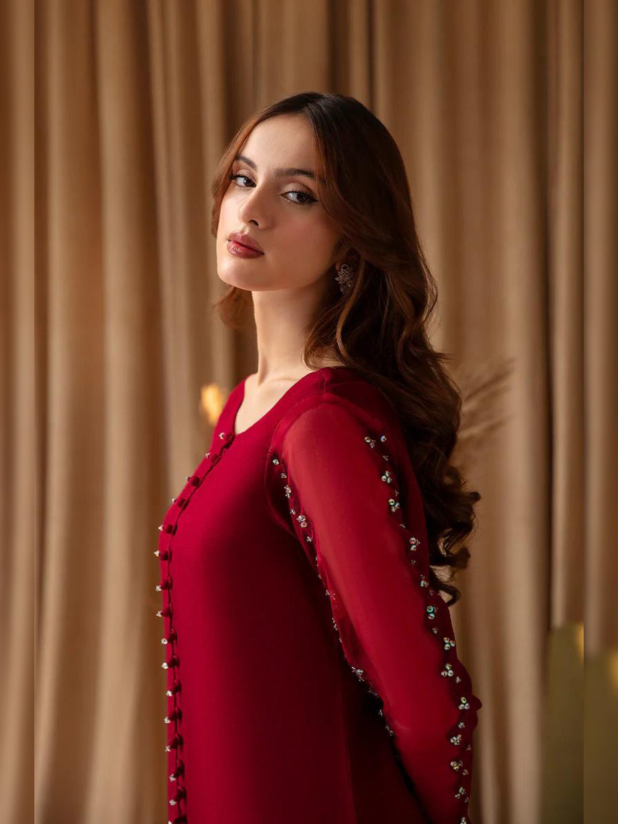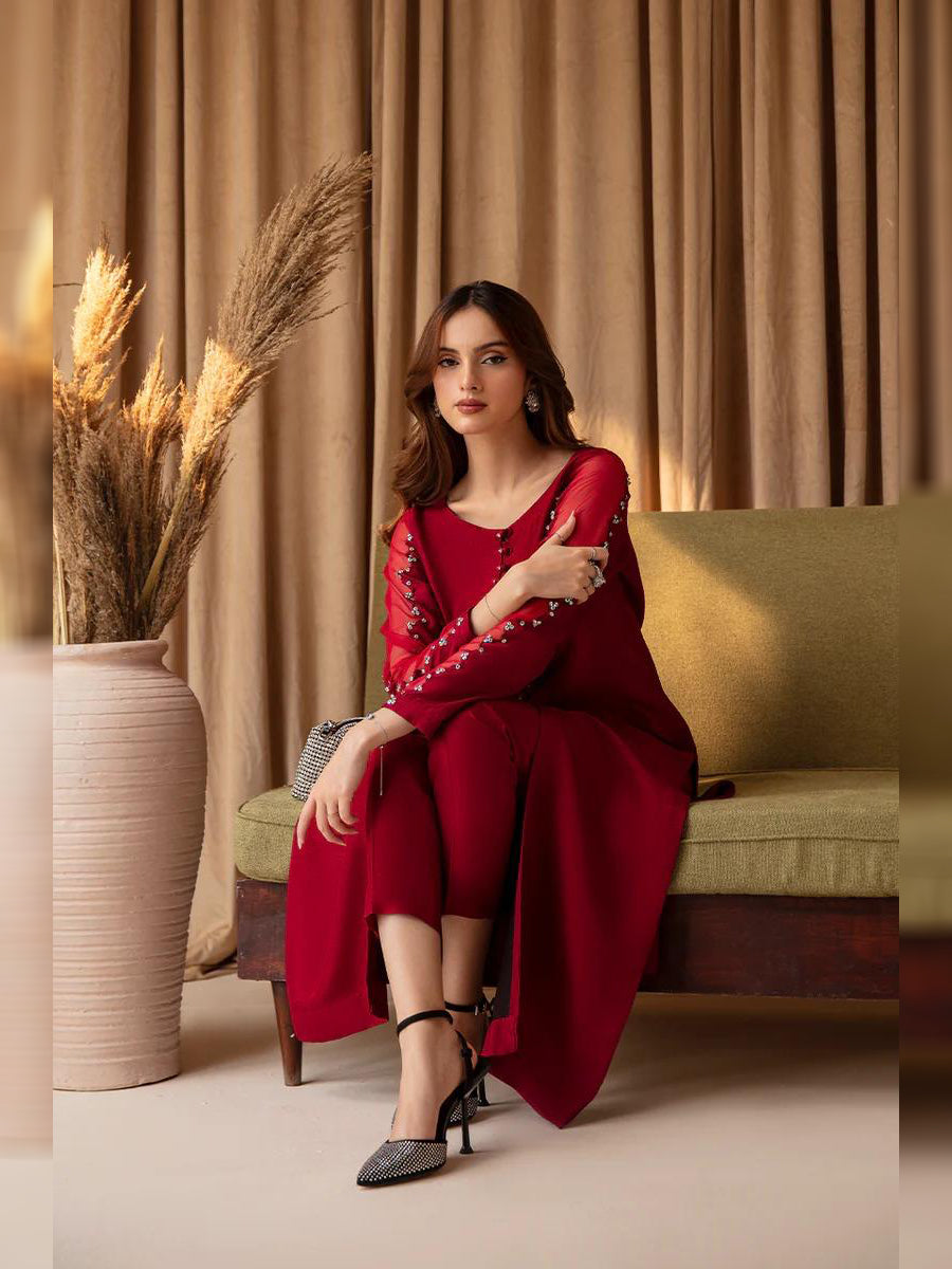 Introducing our elegant 3-piece raw silk dress boasting beautifully hand-crafted sleeves and a front center button, adorned with intricate lace on the dupatta. Complete with a straight trouser for a sophisticated look.