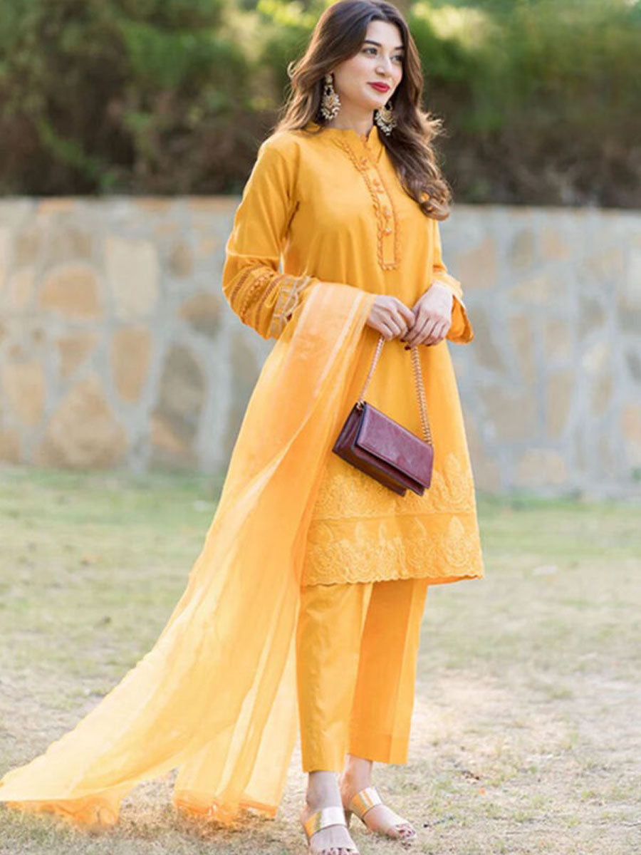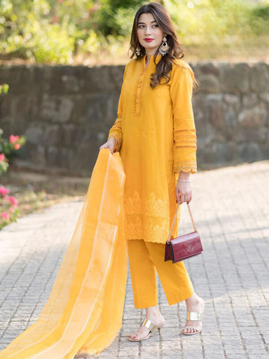 Introducing a stunning new addition to our collection: the Honey Glow Embroidered Cotton Dress. Intricate embroidery adds a touch of sophistication to the dress, creating a visually stunning piece. Made from soft, breathable cotton, this dress ensures maximum comfort throughout the day. Pair the dress with the included pant for a chic and modern look, or wear it alone for a more casual vibe. Delicate lace detailing enhances the overall aesthetic of the outfit, adding a feminine touch.