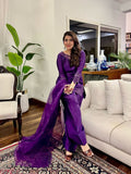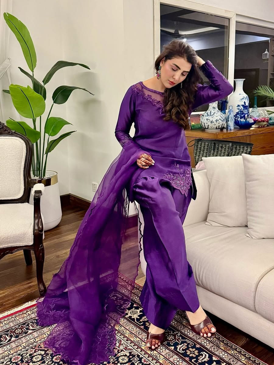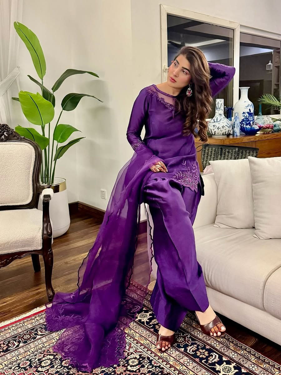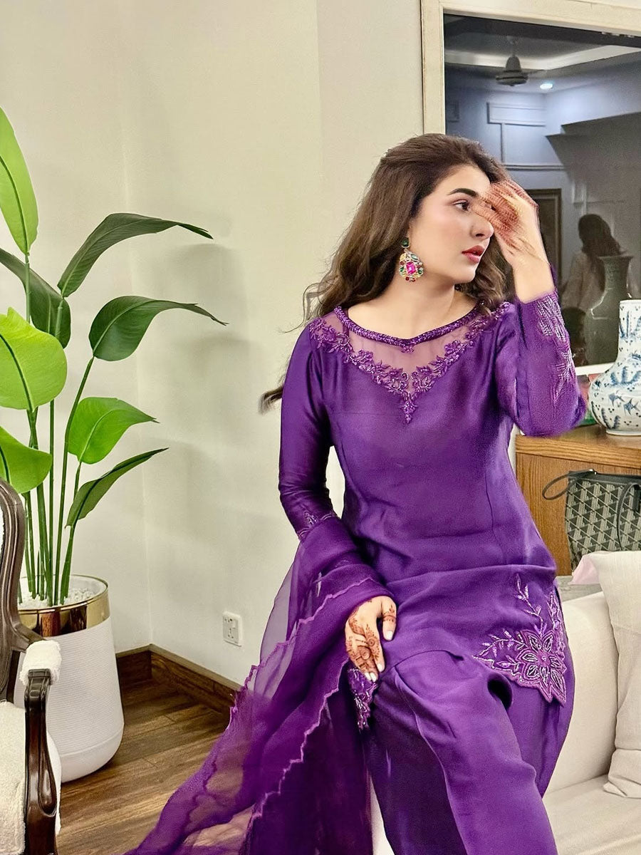 Now live, the Lavender Luxe 3-piece raw silk set featuring a short dress with embroidered patch bunches on the daman and gala, paired with a farshi shalwar and a dupatta adorned with matching patches.