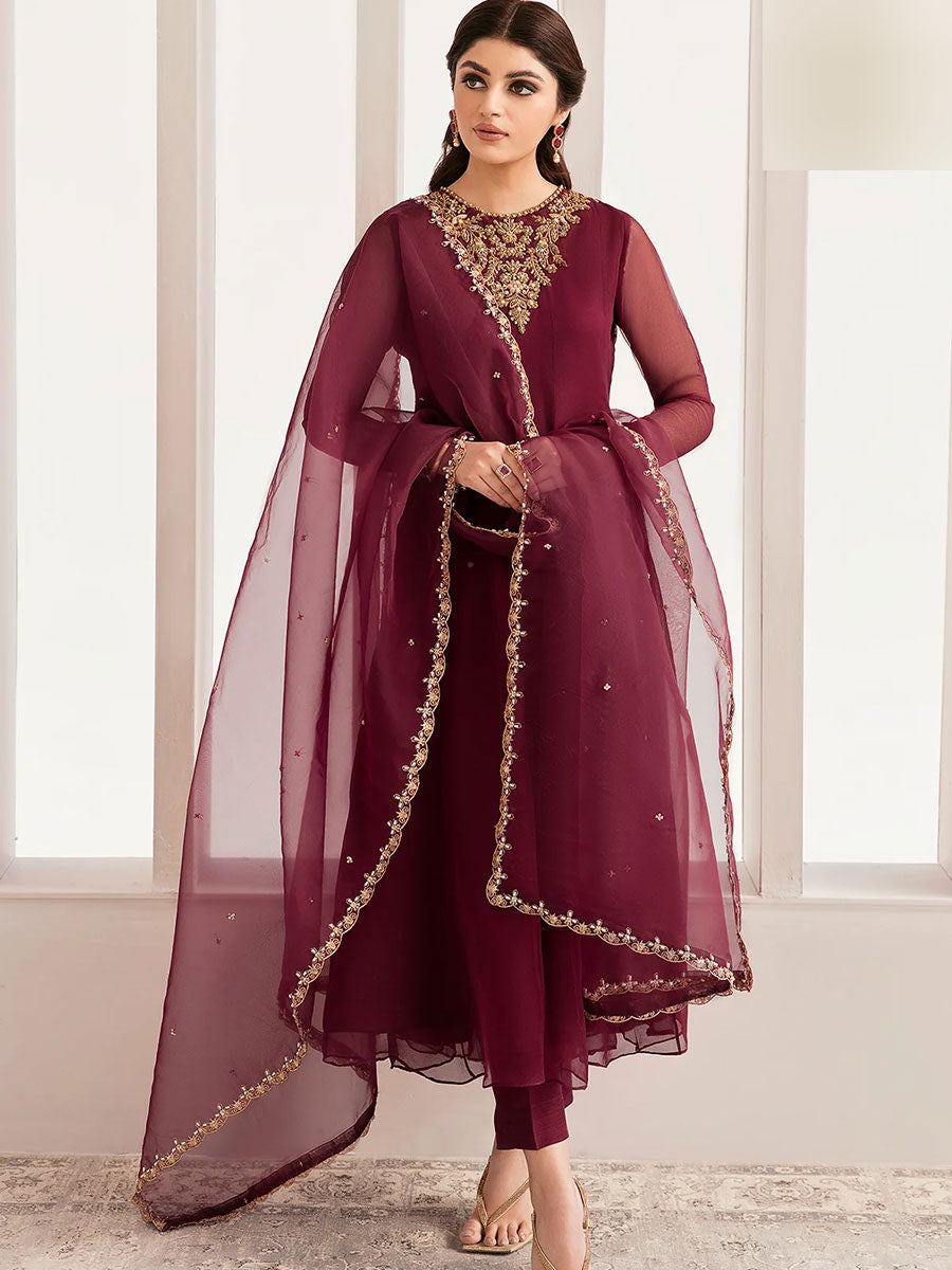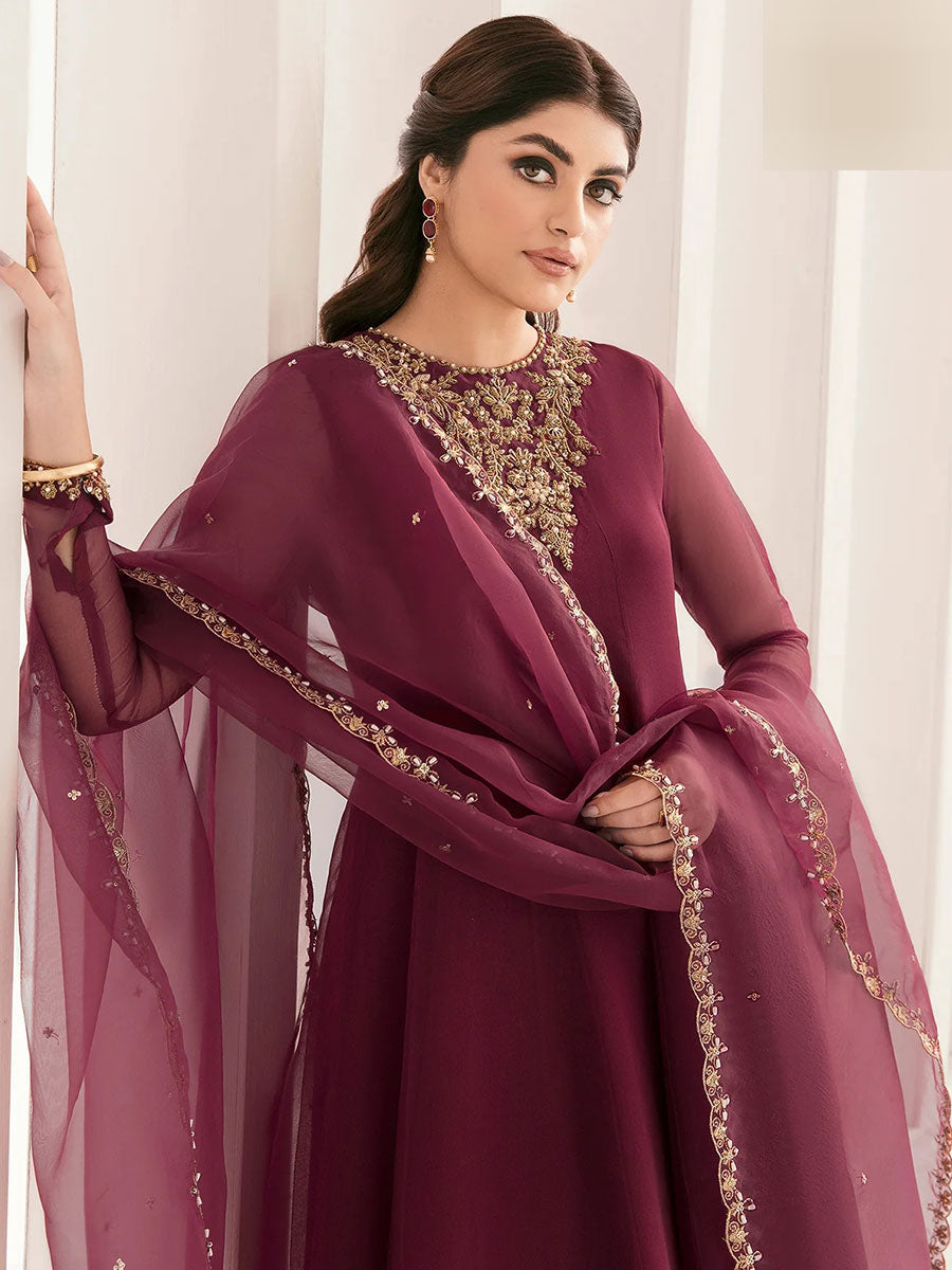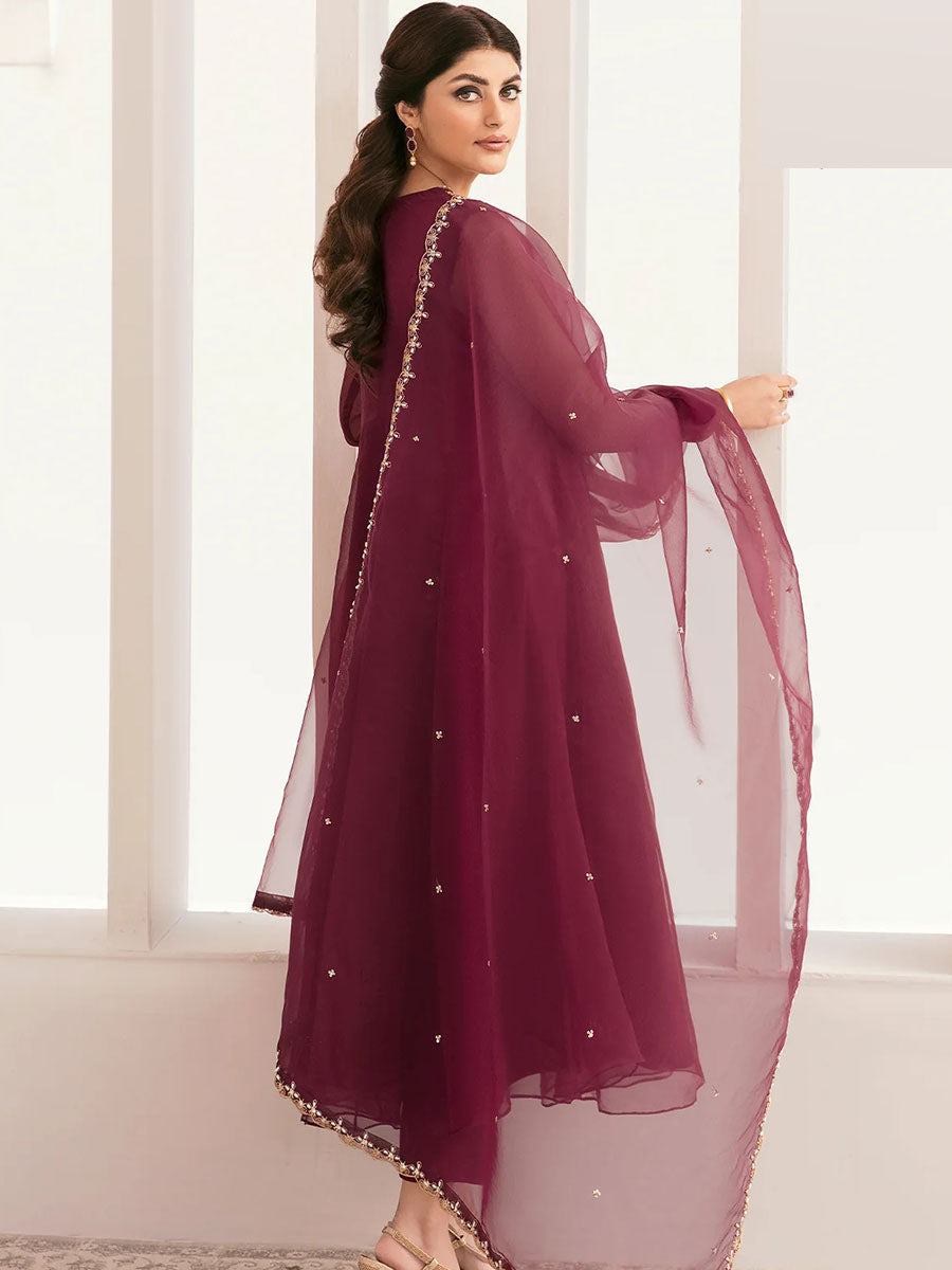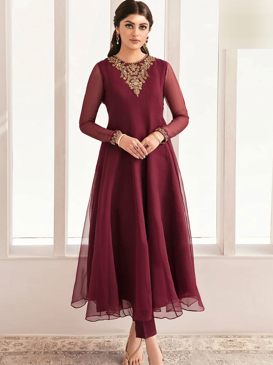 Expertly crafted with high-quality organza, this 3-piece set features a long kalidaar frock adorned with beautifully detailed zari embroidery. The kora dabka hand craft on the neck, sleeves, bottom, and dupatta border adds a touch of elegance to this stunning outfit. Elevate your wardrobe with this timeless and exquisitely designed ensemble.