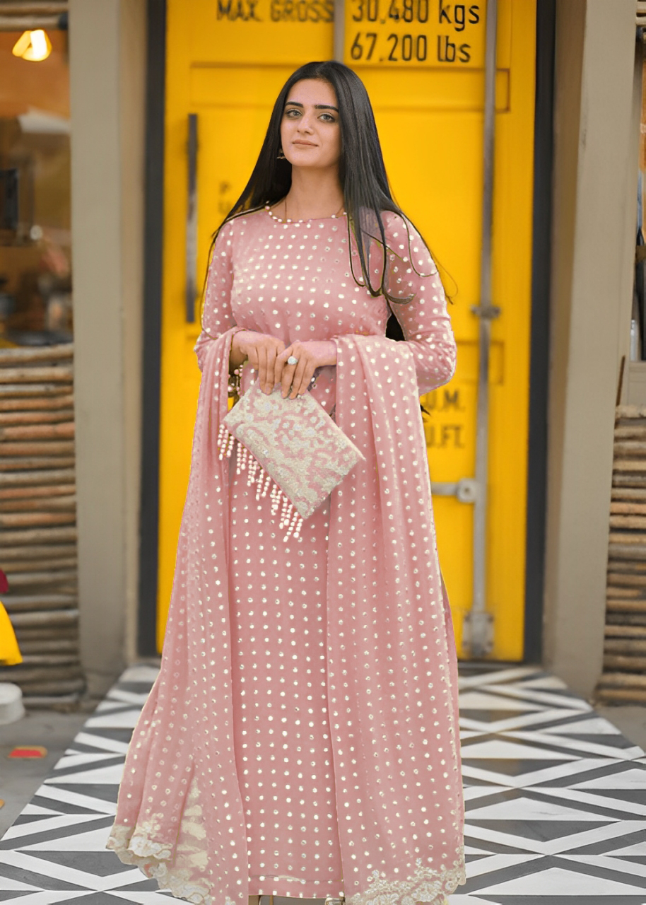 This dress boasts a lovely mix of chiffon and intricate 9mm sequins embroidery on the front, back, sleeves, and dupatta. The thread and zari embroidered pallu boarder adds a touch of beauty and craftsmanship to create an essential piece for any special event.
