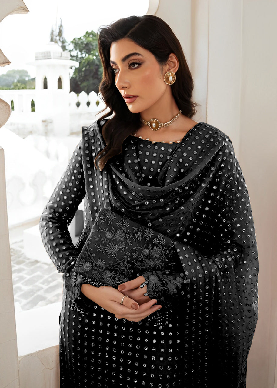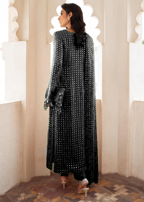 This dress boasts a lovely mix of chiffon and intricate 9mm sequins embroidery on the front, back, sleeves, and dupatta. The thread and zari embroidered pallu boarder adds a touch of beauty and craftsmanship to create an essential piece for any special event.