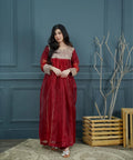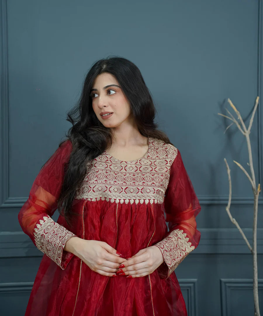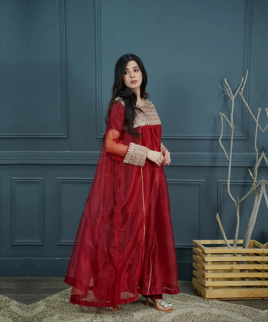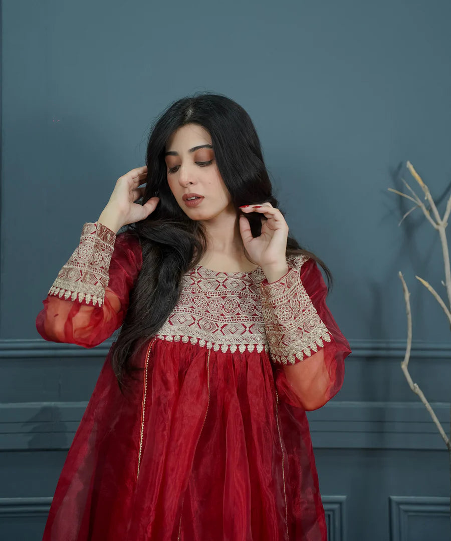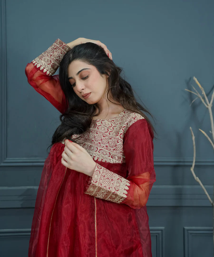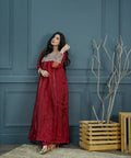 This is a graceful deep red maxi dress that reflects timeless elegance and femininity. The dress features a beautifully embroidered yoke in soft golden tones, adding a rich traditional touch. The sheer overlay creates a light, flowy look, while the long sleeves with embroidered cuffs enhance its refined appeal.